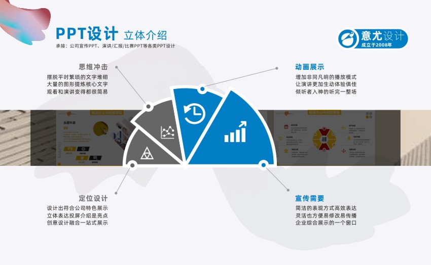 蘇州意尤文化傳播有限公司是一家有著多年廣告設(shè)計(jì)經(jīng)驗(yàn)的蘇州知名廣告企業(yè) 主要業(yè)務(wù)有蘇州PPT設(shè)計(jì)、蘇州產(chǎn)品PPT設(shè)計(jì)、蘇州企業(yè)PPT設(shè)計(jì)、蘇州會(huì)議PPT設(shè)計(jì)、蘇州項(xiàng)目PPT設(shè)計(jì)、企業(yè)VI設(shè)計(jì)、設(shè)計(jì)印刷宣傳冊(cè)/樣本/單頁(yè)/名片等 自2007年成立以來(lái),蘇州意尤廣告公司與蘇州及蘇州各市的幾百家中外企業(yè)進(jìn)行了廣告設(shè)計(jì)合作,經(jīng)過(guò)多年發(fā)展公司已形成了以企業(yè)PPT設(shè)計(jì)、企業(yè)VI設(shè)計(jì),廣告設(shè)計(jì),廣告印刷,樣本設(shè)計(jì),宣傳冊(cè)設(shè)計(jì),名片印刷,菜譜制作,單頁(yè),宣傳單等一批特長(zhǎng)業(yè)務(wù),相信在各位新老客戶(hù)的關(guān)心下,本公司會(huì)得到更大的發(fā)展,同時(shí)為客戶(hù)的發(fā)展宣傳保駕護(hù)航。